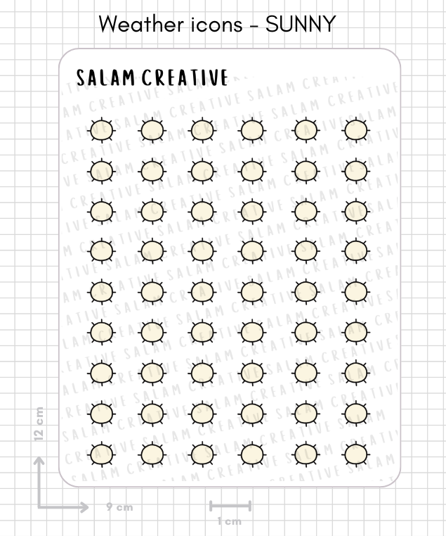 Sheet size 12x9 cm (approximately 3.5x4.7 inches). Individual sticker size varies according to the design; widest measurement: 12x9mm, (approximately 1/2"x3/8").